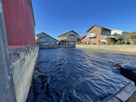解体した後の草が生えないようにシート貼りもやります。この上に採石もしく真砂しいたりしたら草は、生えてきません解体した後処理もお話し次第させていただきます。