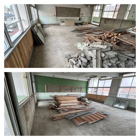 学校の改修工事です。はつりもあり階段で搬出でしたので大変でした。